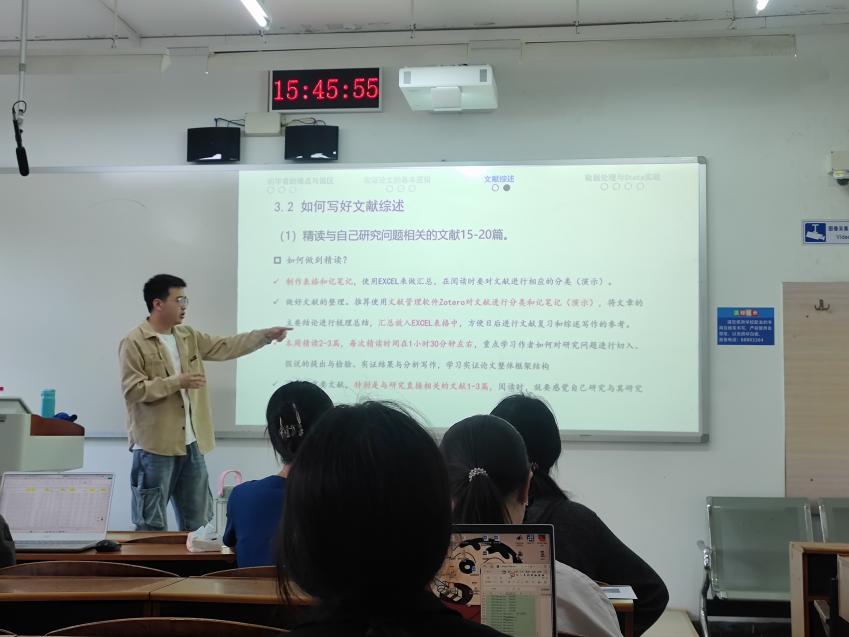 5月8日下午,经济管理学院励学论坛第七期在励学楼310教室举行,beat365英国官网经济管理学院经济研22级在读优秀研究生赖凯丰进行了主题为“研究生论文写作分享”的讲座。本次讲座赖凯丰同学结合自身在学术道路上摸索的经验对研究生论文写作的思路和方法作了详尽的介绍。首先他点出论文初学者的难点和误区,主要是缺乏理论认识和知识创新理解导致内容逻辑不足。其次,讲解了实证论文的基本逻辑。然后着重讲解了论文中的文献综述部分...