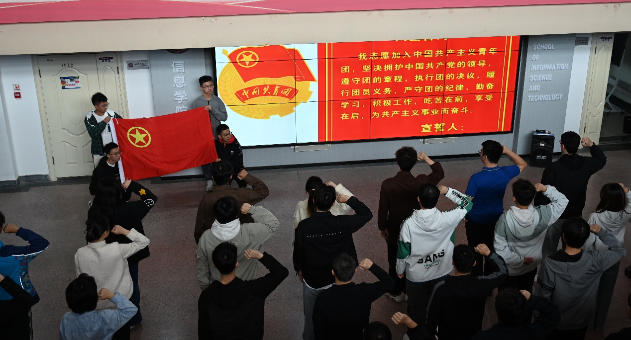 金秋十月,桂子飘香。10月12日中午,信息学院在瀚学楼十层大厅举行2024年新团员入团宣誓仪式。信息学院党委副书记陈卫、学院团委书记杨和家、150余名新老团员代表参加活动。仪式现场,气氛庄重而热烈,新团员们怀揣着对团组织的向往和为共产主义事业奋斗的坚定信念,齐聚一堂。他们将在这个美好的秋天,用铮铮誓言奏响青春的乐章。学院党委副书记陈卫老师为新团员代表佩戴团徽,颁发团员证。祝贺新团员加入共青团大家庭,开启人...