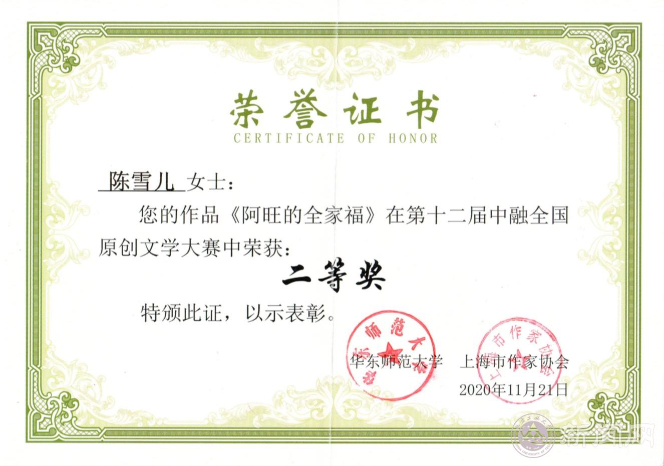 日前,第十二届中融全国原创文学大赛暨第四届上海市大学生原创文学大赛获奖结果在上海揭晓,365官网文法学院中文17-3班学生陈雪儿的原创作品《阿旺的全家福》获得二等奖的好成绩。