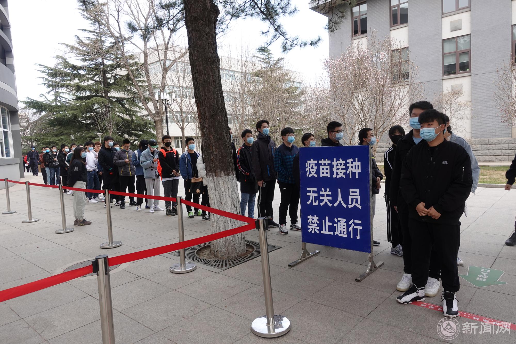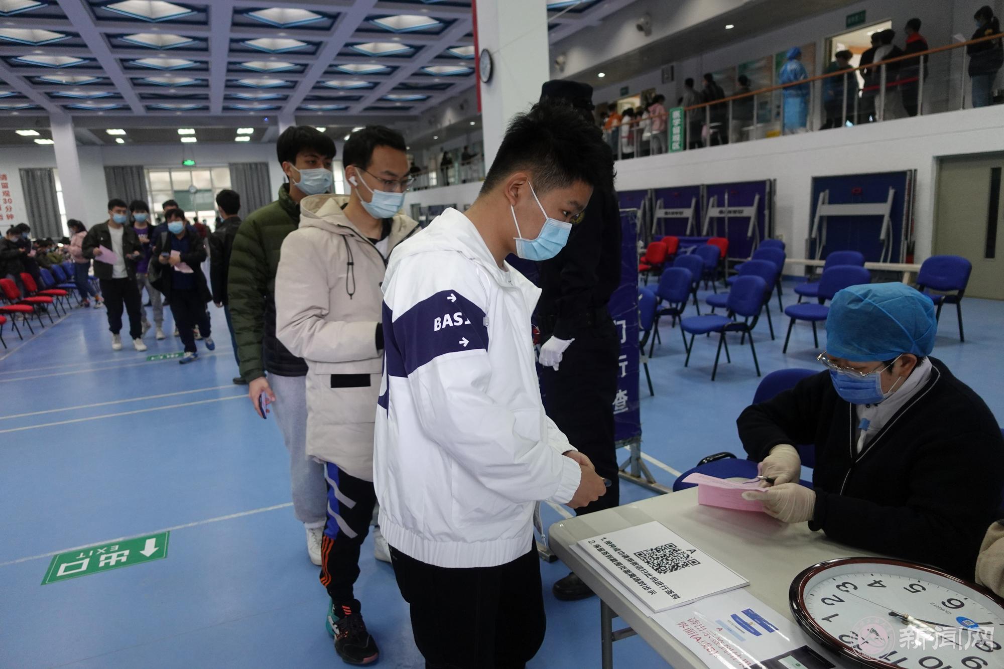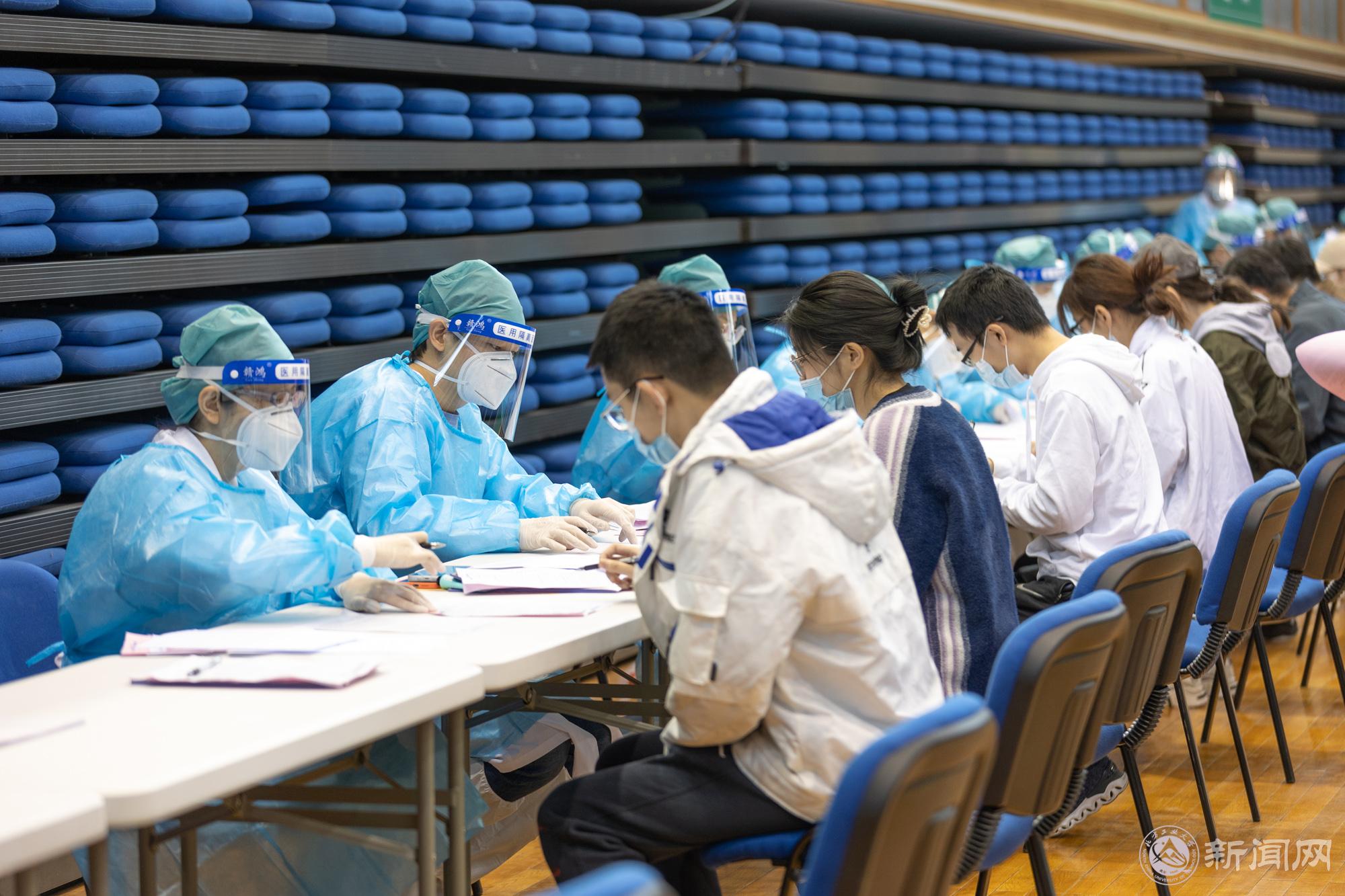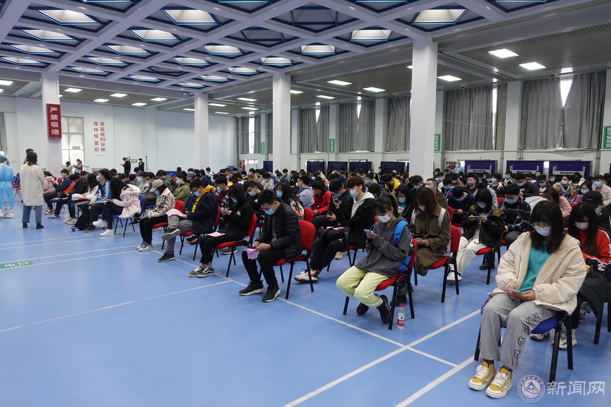 3月24日起,各学院组织在校学生分批开始大规模的接种。同学们按照一米线距离有序排队,随着地标和指引牌自广学桥进入体育馆二层,在入口扫码签到,经健康筛查和体温检测后进入登记区。