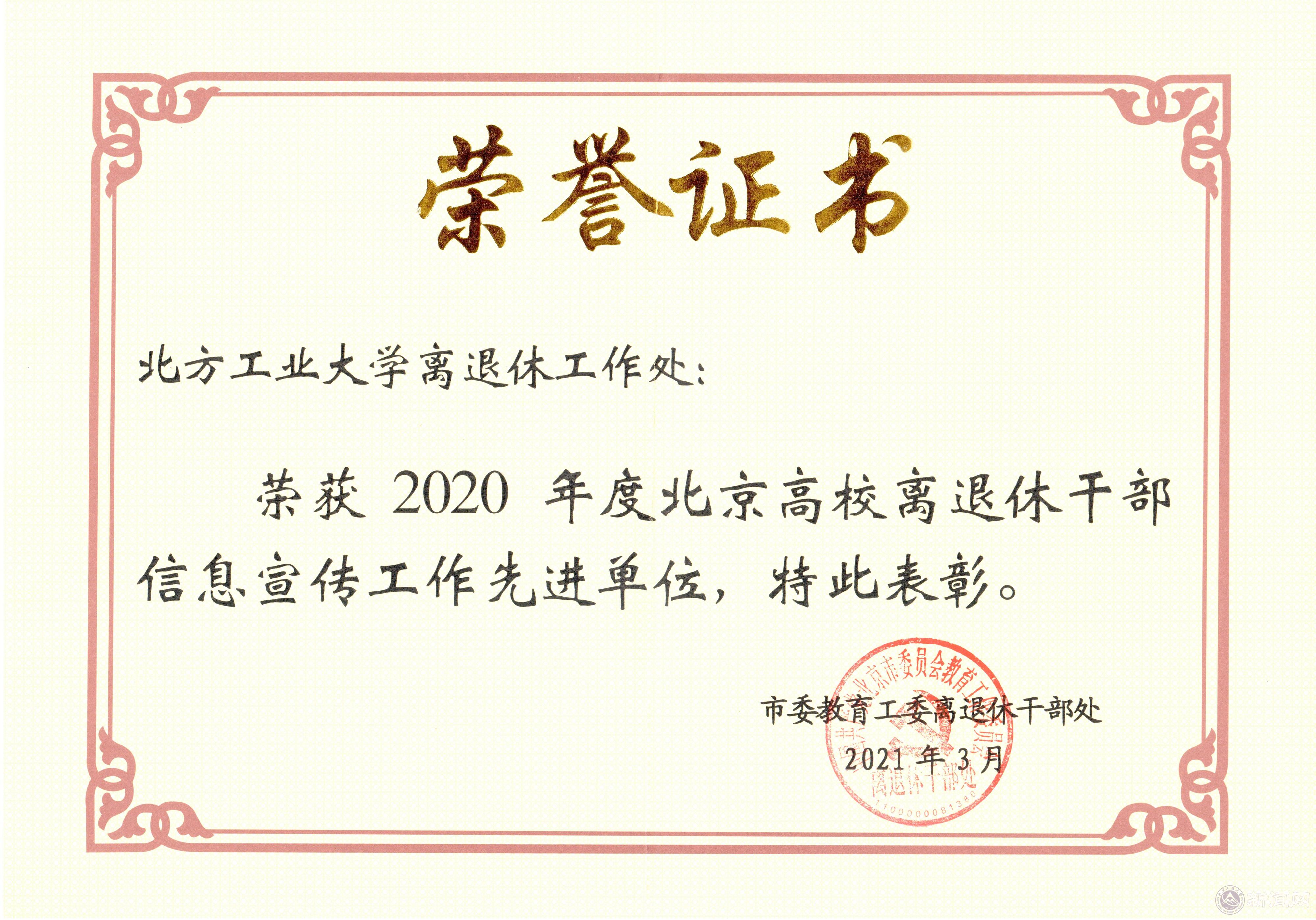 在日前召开的2021年北京高校离退休工作部门负责人会议上,365官网离退休工作处被评为“2020年度北京高校离退休干部信息宣传工作先进单位”。
