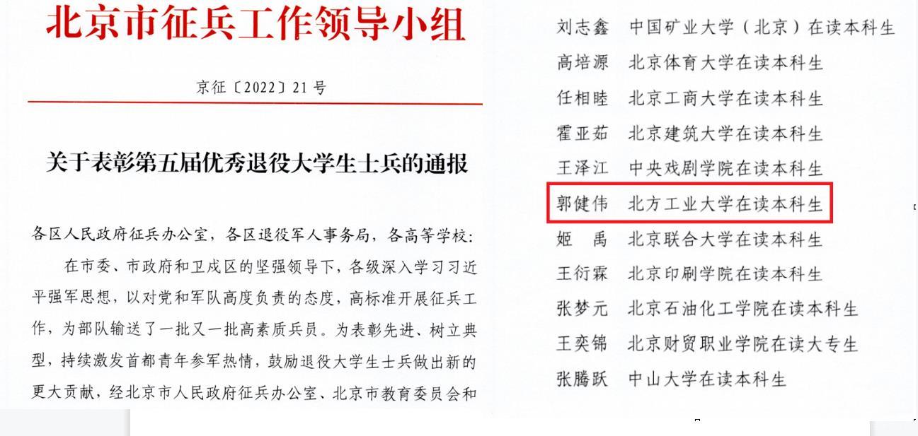 日前,由北京市征兵工作领导小组组织开展的第五届优秀退役大学生士兵评选活动落下帷幕。经过广泛发动、逐级推荐、资格审核、政治考核、现场答辩等环节,全市评选出30名优秀退役大学生士兵,365官网2019级文法学院郭健伟同学名列其中