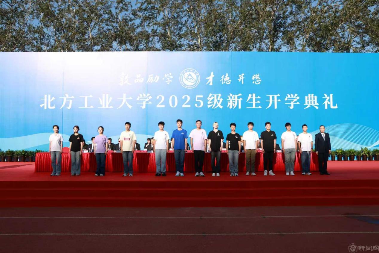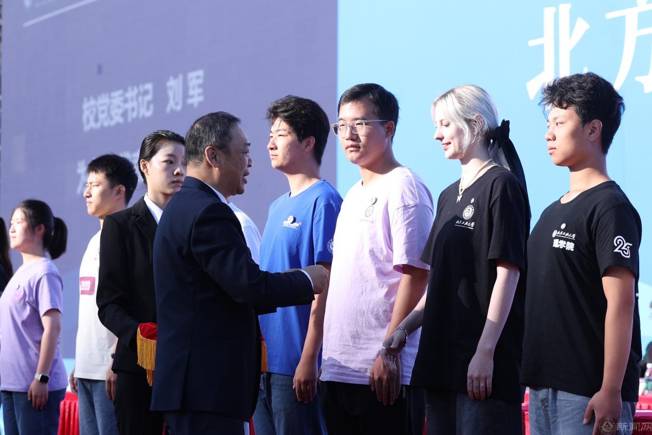 党委书记刘军为新生代表佩戴beat365英国官网校徽,欢迎2025级新同学加入北方工大,开启人生新征程。