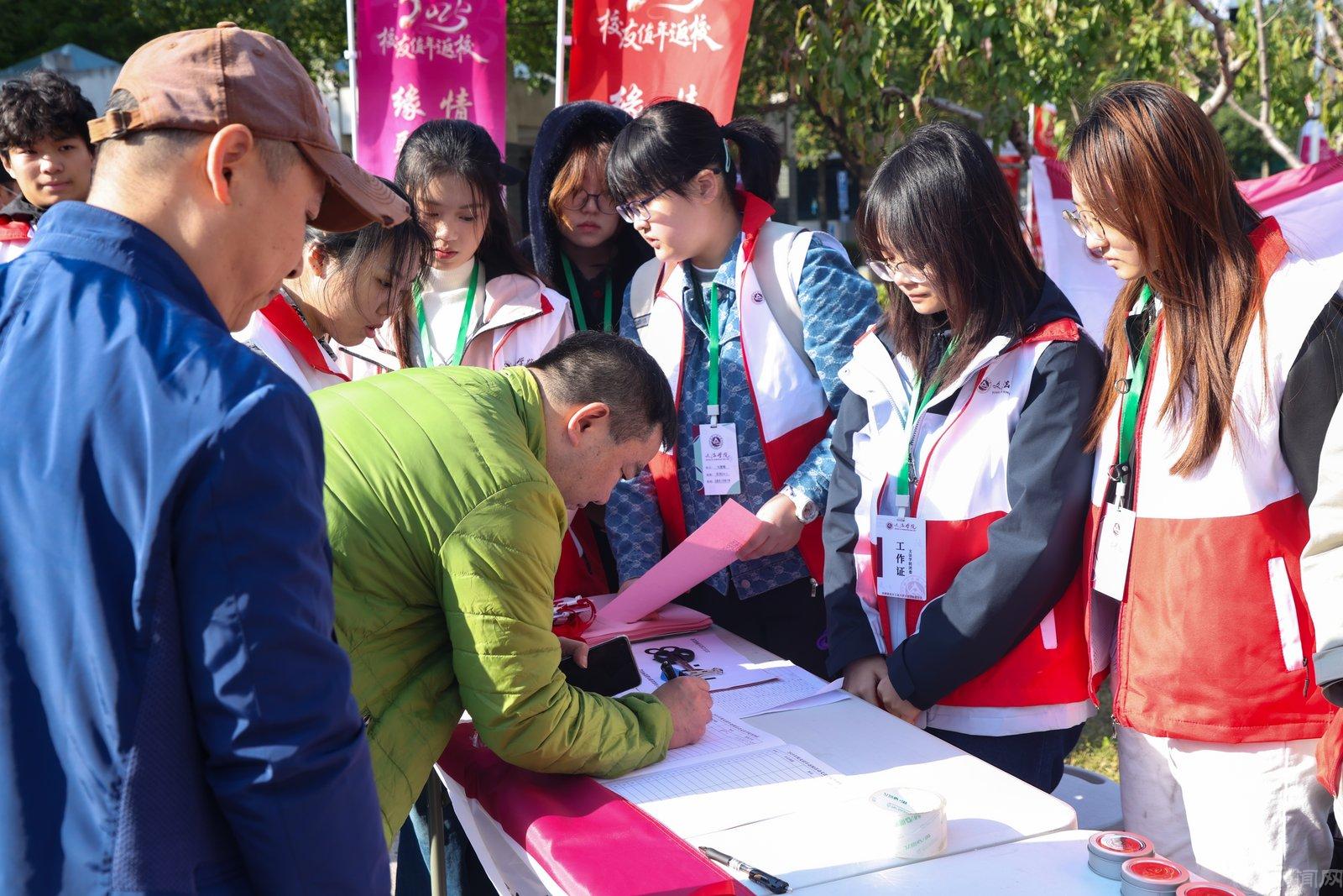 上午8时,钟秀广场就已人流涌动,校友们早早来到签到点报到,各学院热情接待,欢迎校友们回家。