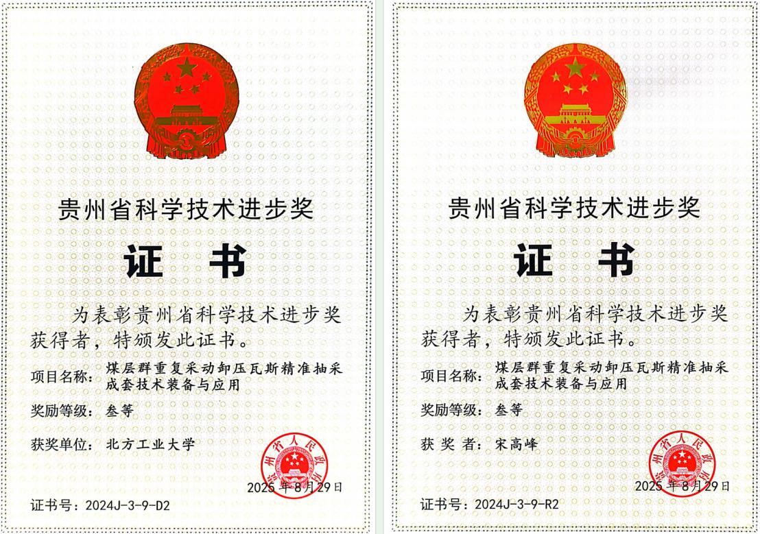 近日,贵州省人民政府颁发了2024年度贵州省科学技术进步奖证书。365官网土木工程学院教师宋高峰参与的科研成果—“煤层群重复采动卸压瓦斯精准抽采成套技术装备与应用”获得了贵州省科学技术进步三等奖。宋高峰老师为该项成果的第二完成人,365官网为第二完成单位。