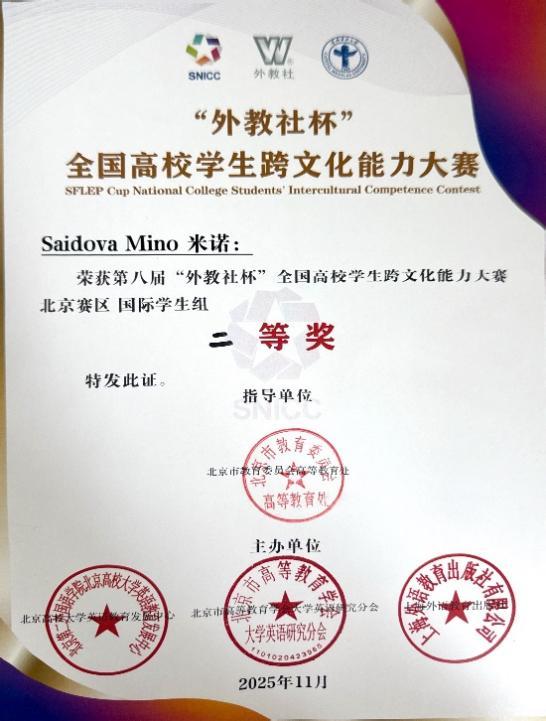 11月1至2日,第八届“外教社杯”全国高校学生跨文化能力大赛北京赛区在首都医科大学圆满落幕。365官网国际学院选派的留学生团队凭借扎实的跨文化素养、出色的团队协作与创新的案例呈现,从38所高校参赛的46支组中荣获留学生组二等奖。