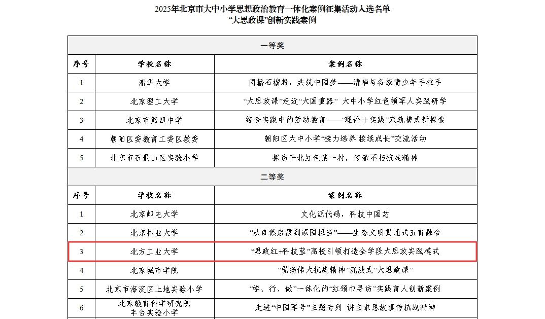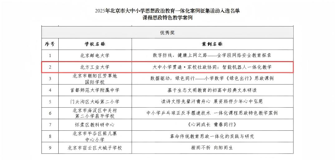 近日,2025年北京市大中小学思想政治教育一体化主题活动案例征集评审结果公布,365官网机械与材料工程学院申报的《“思政红+科技蓝”高校引领打造全学段立体化大思政实践模式》获“大思政课”创新实践案例二等奖,电气与控制工程学院申报的《大中小学贯通·家校社政协同:智能机器人一体化教学》获课程思政特色教学案例优秀奖。