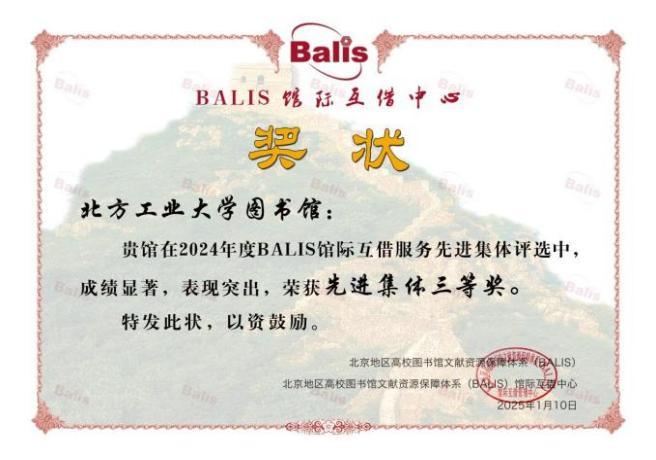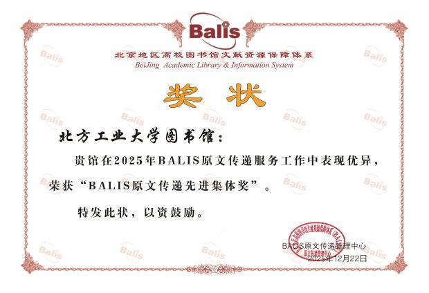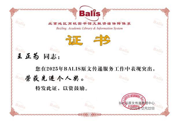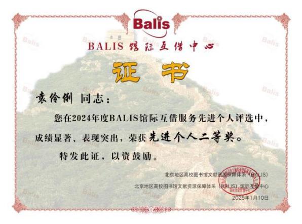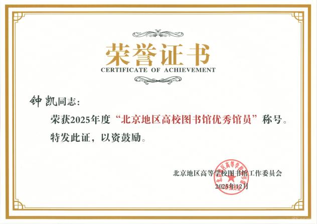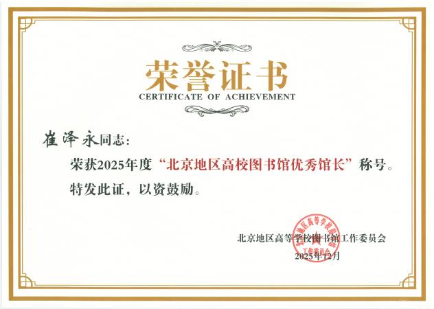 副馆长崔泽永荣获“北京地区高校图书馆优秀馆长”称号,采编部主任钟凯荣获“北京地区高校图书馆优秀馆员”称号。在北京高校网络图书馆(网图)联盟举办的“优秀大学生管理员”评选中,21 名 “蓝马甲” 学生馆员荣获该殊荣。在2024年度BALIS馆际互借服务先进评选中,图书馆荣获“先进集体三等奖”,借阅部主任(代)袁伶俐荣获“先进个人二等奖”。2025年BALIS原文传递服务工资评选中,图书馆荣获“BALIS 原文传递先进集体奖”,咨询部馆员王正为荣获“先进个人奖”。