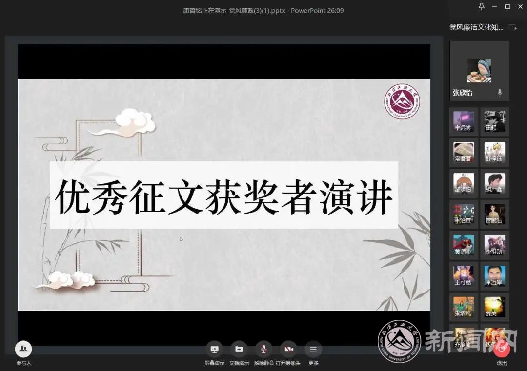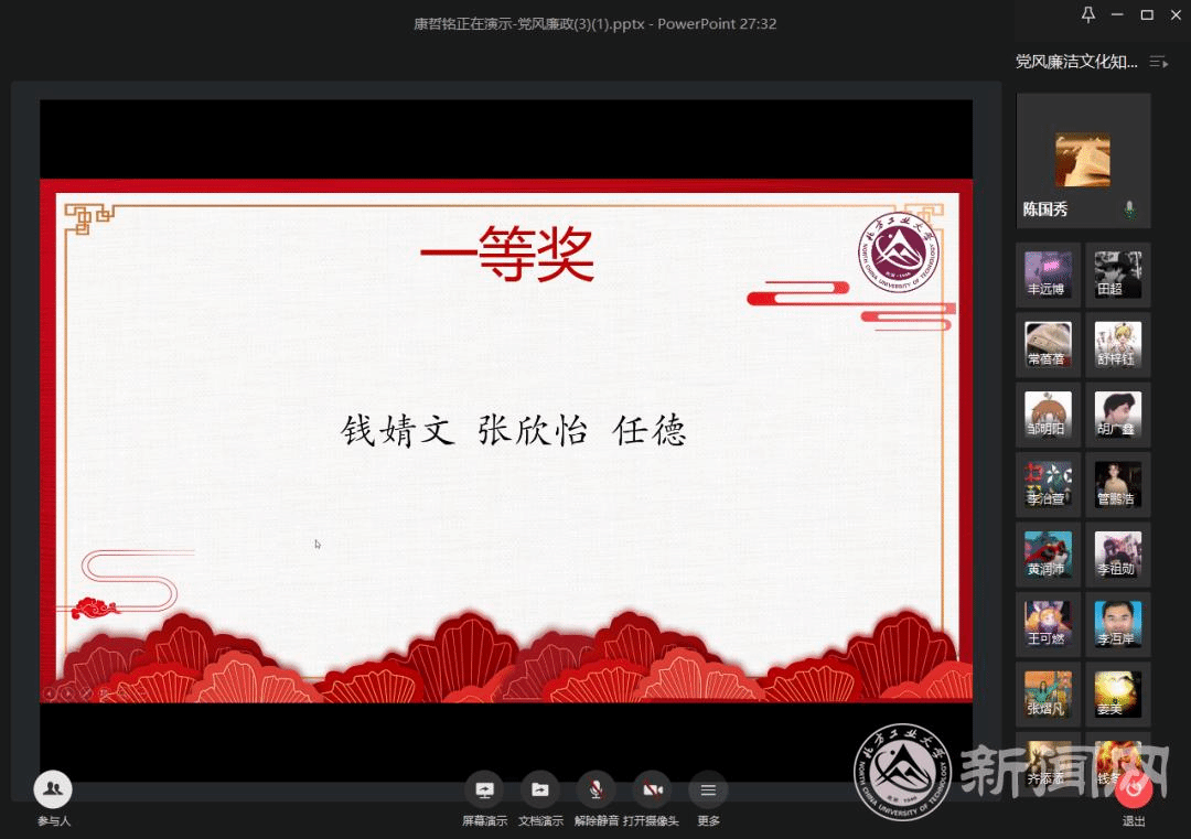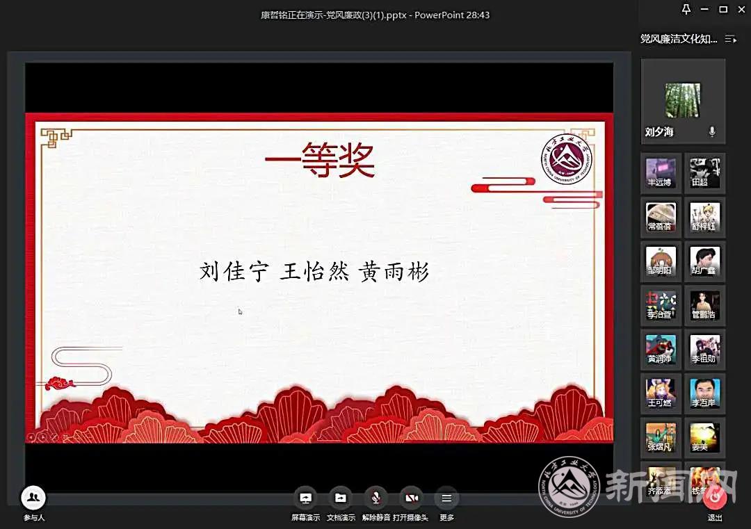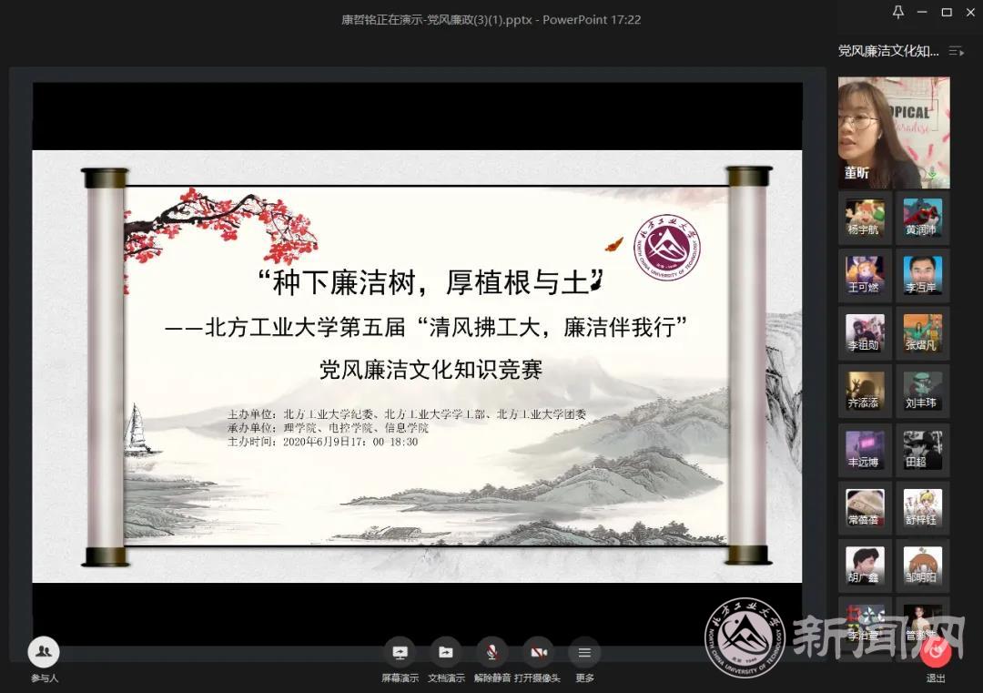 6月9日下午,由校纪委、校学工部、校团委主办,信息学院党委、电气与控制工程学院党委、理学院党委联合承办的“种下廉洁树,厚植根与土”——beat365英国官网第五届“清风拂工大,廉洁伴我行”党风廉洁文化知识竞赛暨在线颁奖仪式隆重举行。校纪委、学工部、校团委、各学院负责人及部分师生参加了颁奖仪式,并参与了网上践诺签名活动。