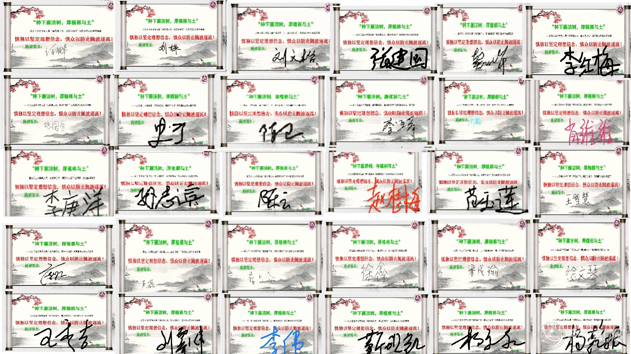 活动展示了百余名师生以“慎独以坚定理想信念,慎众以防止随波逐流”为主题的践诺签名帖。践诺签名活动号召全校师生以签名形式许下个人承诺,从自身做起,廉洁自律。