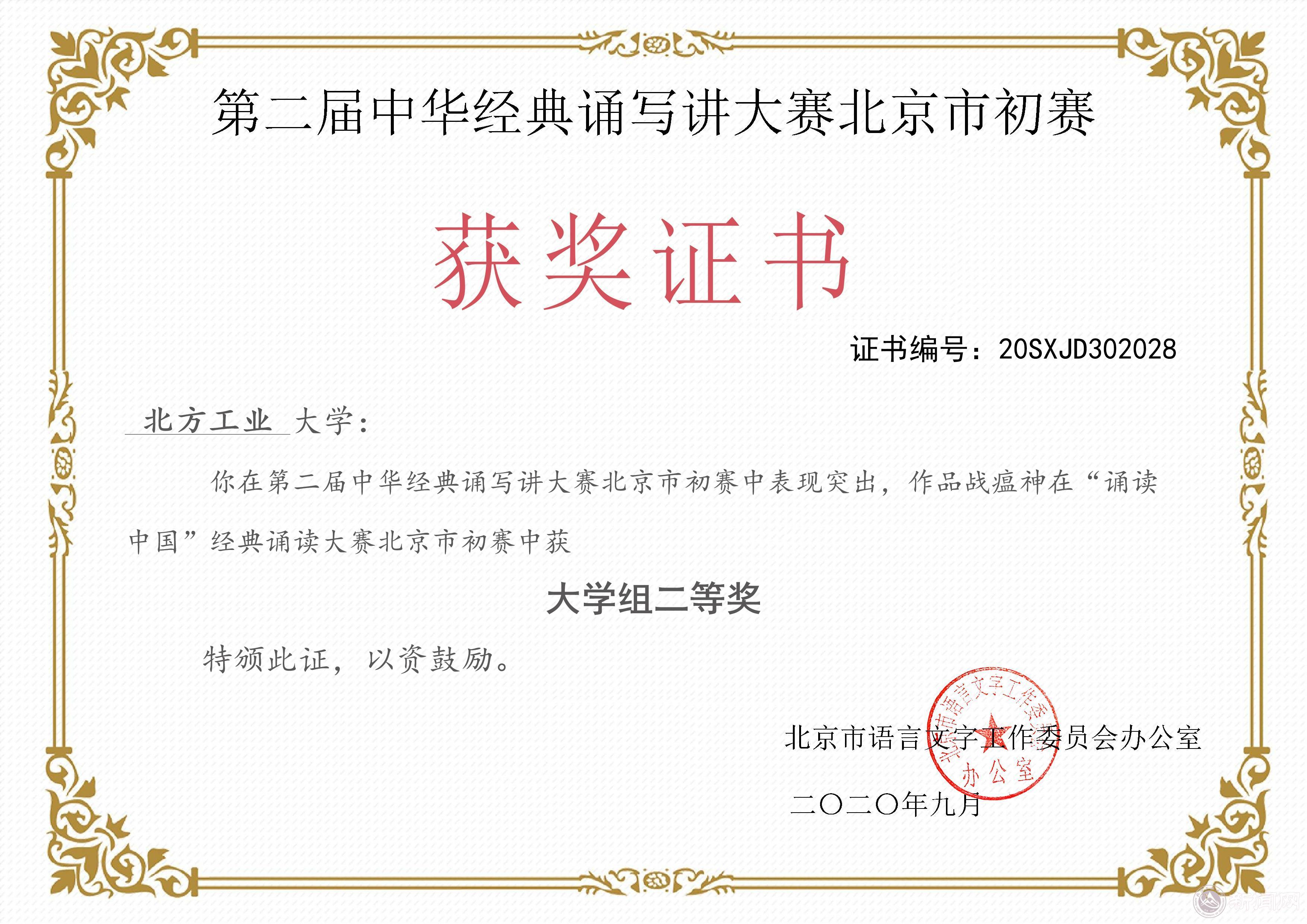 近日,第二届中华经典诵写讲大赛北京市初赛获奖名单公布,365官网选送的作品《战瘟神》(朗诵者:李文浩、王志健、唐浩然、杨徐子琳、李砚辉、兰青)、《南湖红船》(朗诵者:张若瑶、刘辰茜、李砚辉、唐浩然、李文浩)在“诵读中国”经典诵读大赛中双双获得大学组二等奖,365官网教师尉峰、孔元明、于隽和张哲获评优秀指导教师。