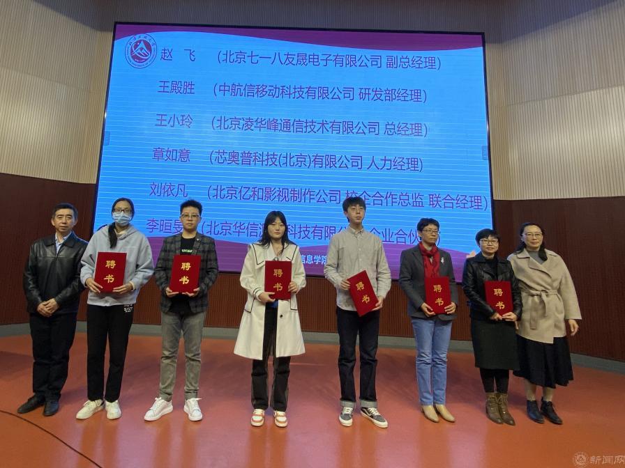 招就处处长董慧凝和信息学院院长马礼为北京七一八友晟电子有限公司副总经理赵飞等6位企业负责人颁发了聘书,正式聘任作为信息学院校外就业导师。