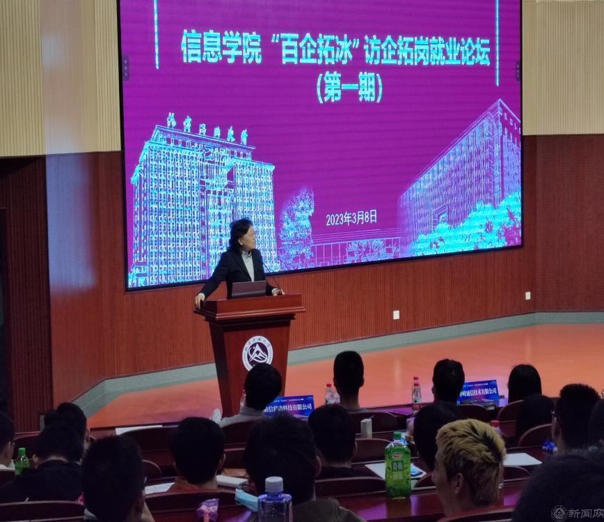 3月8日上午,信息学院在文化会堂组织开展了第一期“百企拓冰”访企拓岗就业论坛活动。北京七一八友晟电子有限公司、北京凌华峰通信技术有限公司、北京亿和影视制作公司等6家企业的招聘负责人受邀到校进行现场交流,校党委常委、副校长栗苹,招生就业处处长董慧凝,信息学院院长马礼、副书记陈卫、辅导员和毕业班导师出席活动,学院2023届毕业生200余人参加了本次论坛。