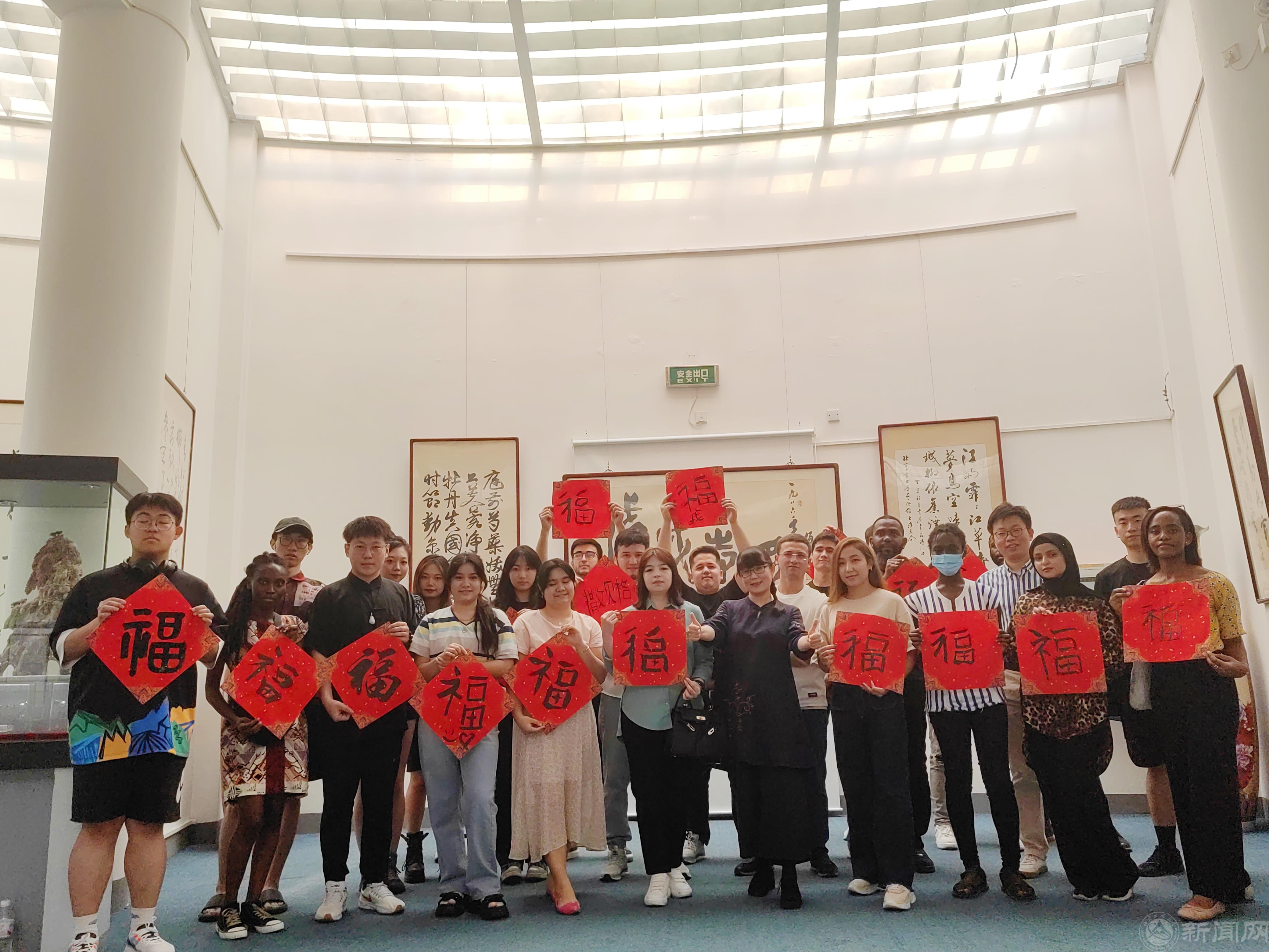2023年5月18日是第47个国际博物馆日。当天下午,365官网艺术馆接待了来自乌兹别克斯坦、刚果金、土库曼斯坦、苏里南、坦桑尼亚等国家的二十余名留学生参观《馆藏精品展》,并现场与艺术馆工作坊的同学们进行福字书写交流,深度体验中国书法的魅力。