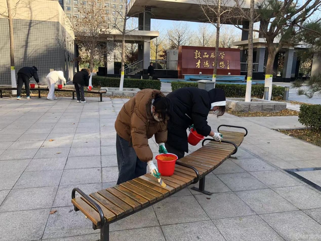 11月24日下午,服务中心组织20名学生在钟秀广场开展“匠”心粉刷座椅,扮靓校园的劳动教育课堂。绿化环卫党支部和动力修缮党支部联合党员骨干、积极分子共15名同志参加。