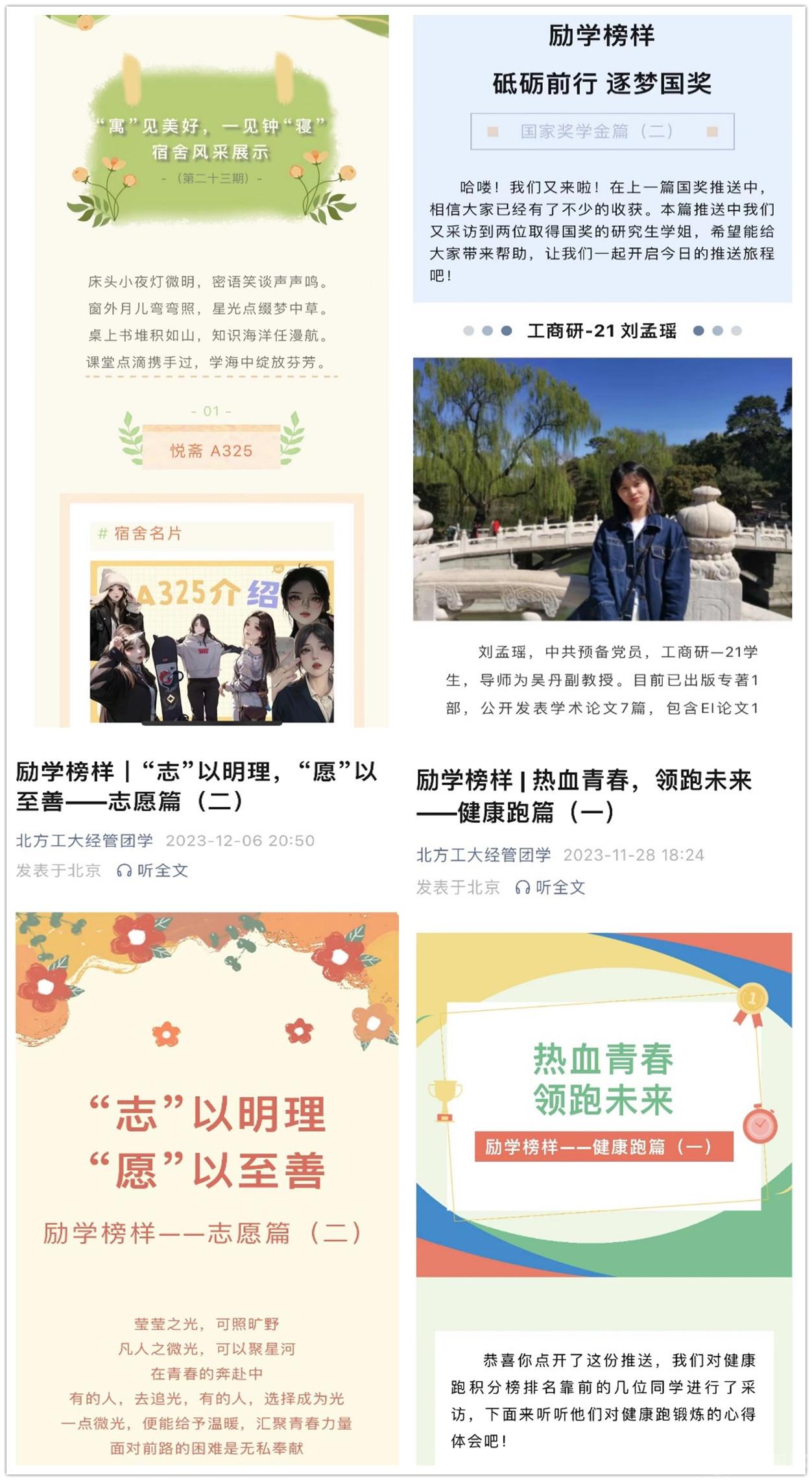 学院建立榜样带动机制,采用线下线上相结合的方式。开展优秀学习笔记评选活动,开展“最强班级”、“最美宿舍”培育评选,推出“‘寓’见经管”宿舍风采展示,选树学风优良、环境整洁的宿舍典型。开展健康跑、奖学金、志愿服务、保研等“励学榜样”先进事迹宣传,选树先进个人典型,营造团结互助、创优争先、见贤思齐的良好学风。通过树榜样,立标杆,培育一个典型,辐射一批学生。此外,紧抓毕业、考研、期末考试等关键节点,明确学生需求导向,组织优秀朋辈资源,围绕出国留学、保研、考研、期末考试等主题,开展“励学畅谈”系列经验分享活动,端正学风。