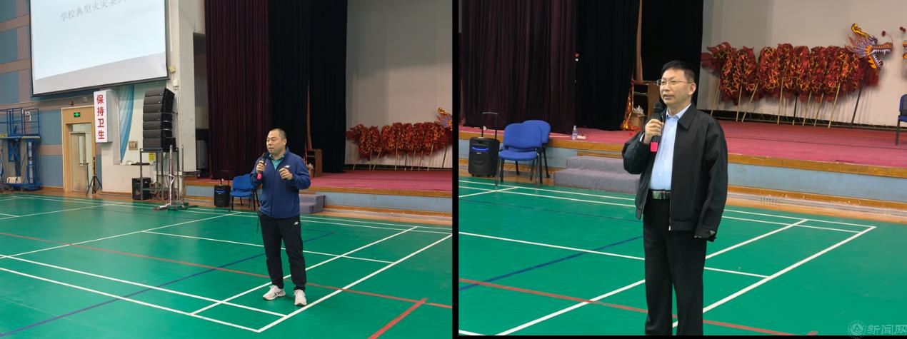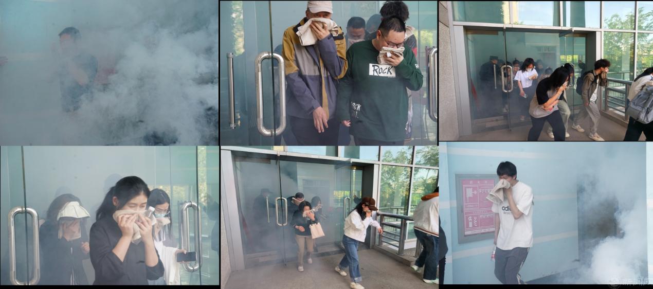 在消防演练单元,随着模拟火情警报声响起,师生根据设定的疏散路线,用毛巾捂住口鼻,弯腰低姿的方式进行疏散,迅速从体育馆二层撤离到了户外广场。疏散过程快速、有序,全体师生配合默契,达到了预期效果。