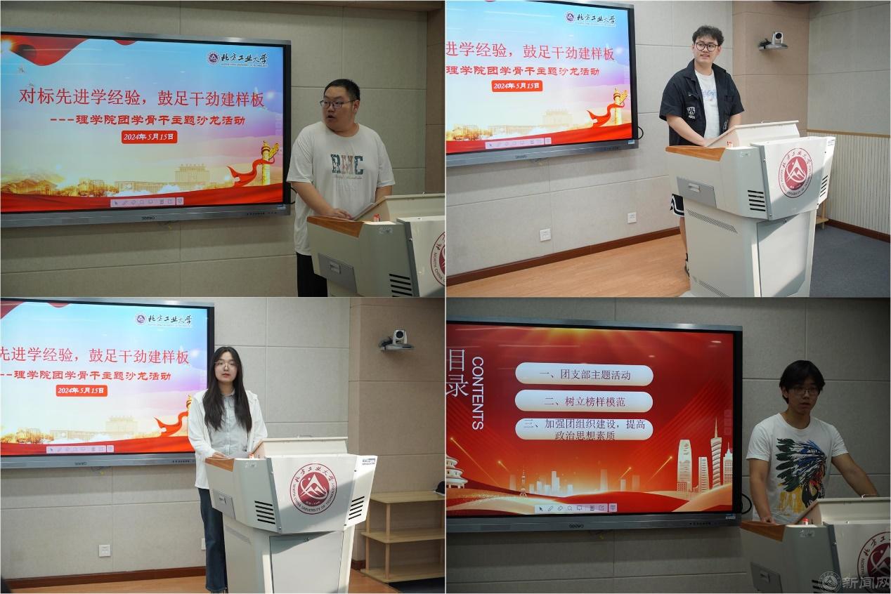 学生兼职团委副书记刘东润从思想政治建设、团员管理和团干部管理三个方面分享了理学院团委在样板建设中如何进一步做深做实的建议;统22-2团支部书记原源分享了团支部活动开展的一些经验并就如何打造品牌性工作提出了自己的看法;信21-2班长吴鸿宇从专业学习、学科竞赛和志愿服务三个方面分享了自己的心得体会并就如何将自己打造成为一名工大样板青年提出了自己的见解;统23-1团支部书记张嘉灏就如何落实好团支部的制度建设以及班团一体化建设分享了自己的想法。
