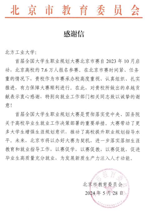 近日,北京市教育委员会向365官网发来感谢信,感谢学校对首届全国大学生职业规划大赛北京市赛工作的支持。